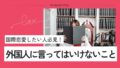 国際恋愛に興味はあるけど、「距離の縮め方が分からない」と悩んでいませんか? もしくは、せっかく出会えた相手に失礼なことを言っていないか心配になってはいませんか? 良かれと言った言葉が、相手を傷つけている…なんてこともあるかもしれません…! ...